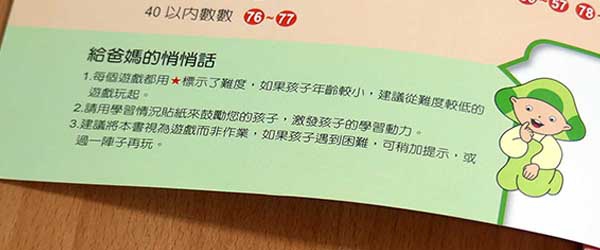 每一冊翻開來第一面都會有一段帶給孩子的話,並附有目錄和給爸媽的悄悄話,一邊讓孩子透過遊戲學習,一邊協助家長陪著孩子一同學習。